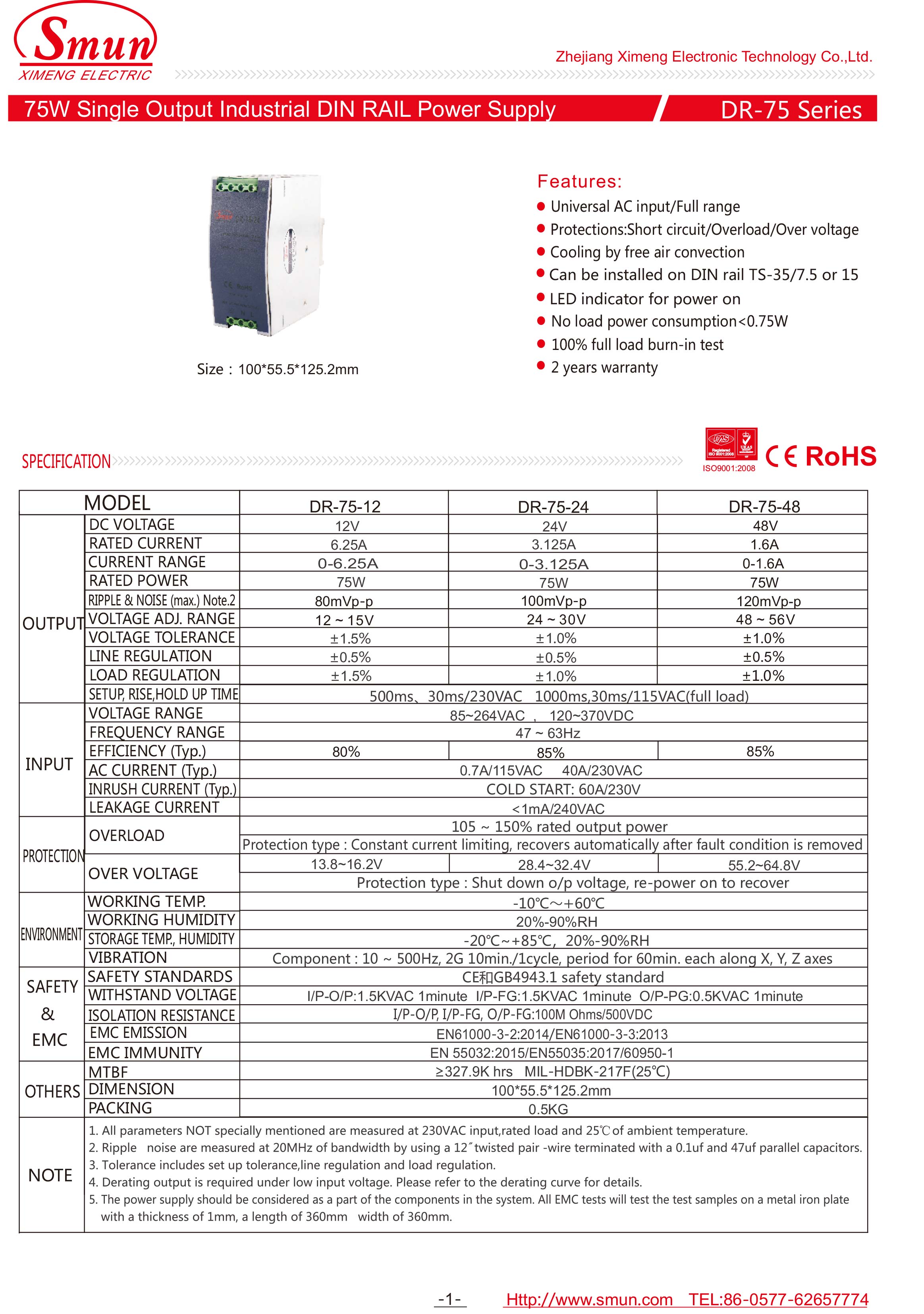 DR-75 está diseñado con una carcasa de plástico que puede prevenir eficazmente al usuario de los peligros eléctricos. Con una eficiencia de trabajo de hasta el 85%, toda la serie puede funcionar a una temperatura ambiente entre -10 ℃ y + 60 ℃ bajo convección de aire.